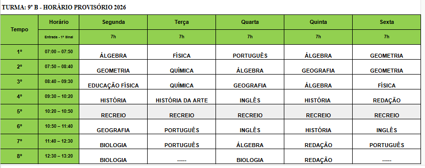 HORÁRIO Provisório 9º ano B – ANO 2026