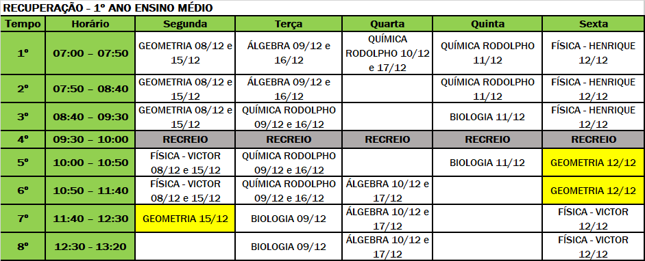 6ª feira, dia 12/12, das 10h às 11h40 e no dia 15/12 às 11h40.